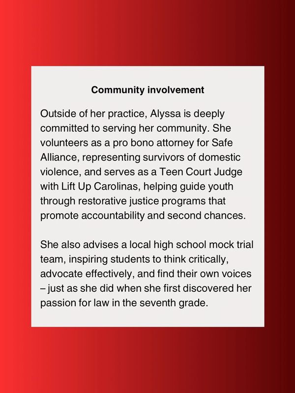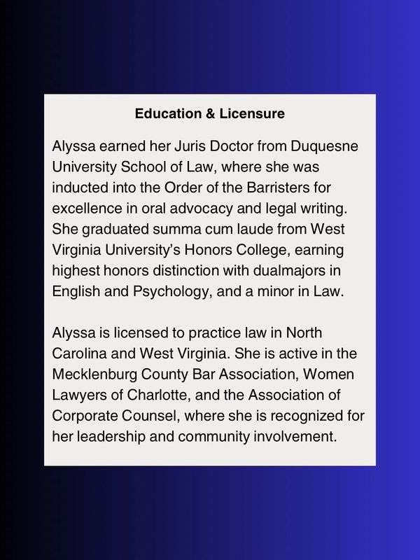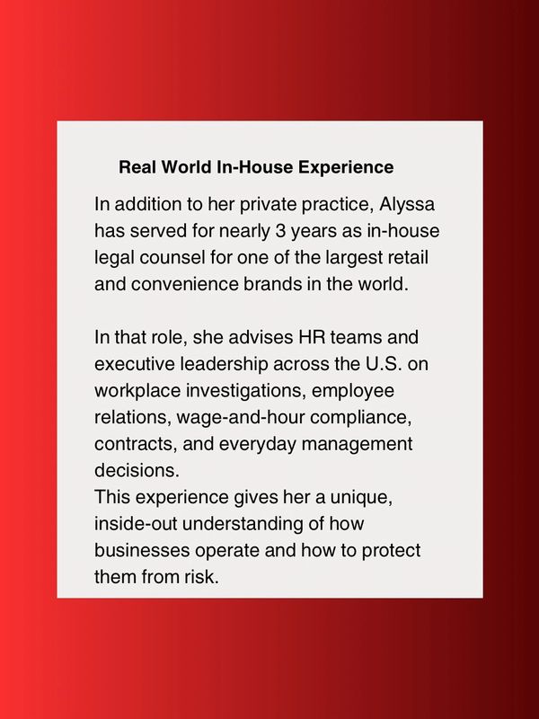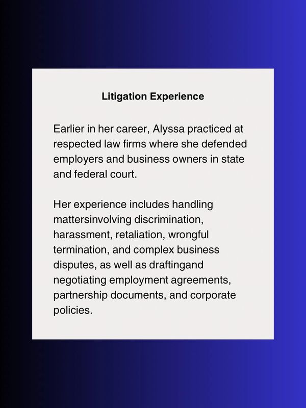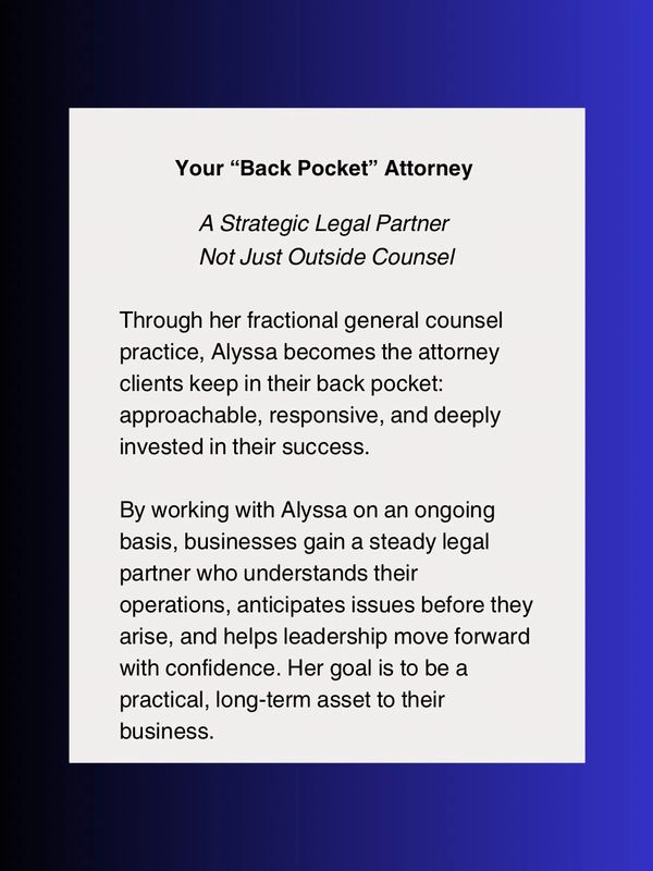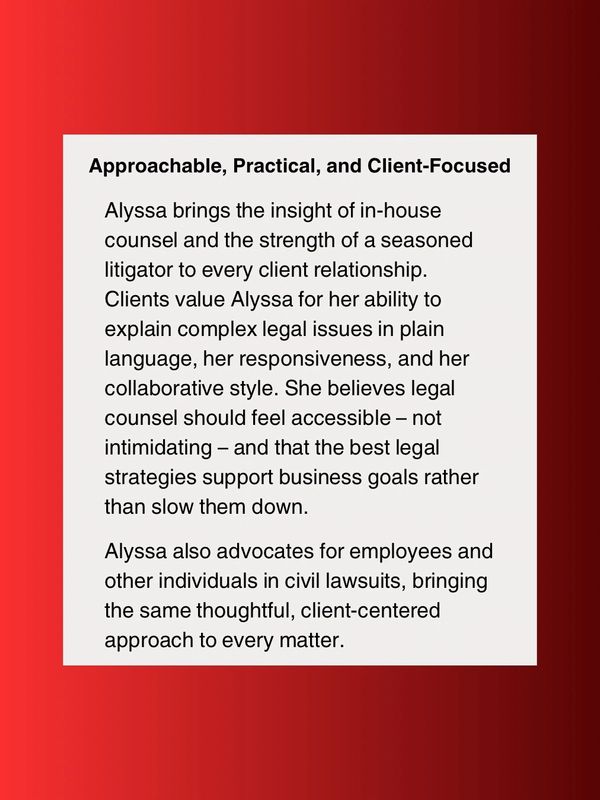 Alyssa Lazar is a business-minded attorney who serves as a trusted legal advisor and strategic asset to companies and professionals navigating growth, risk, and day-to-day decision-making. As the Managing Attorney of Lazar Law PLLC, Alyssa provides fractional general counsel services, along with employment law and civil litigation support – giving clients reliable, on-demand legal guidance without the cost or complexity of a full-time in-house hire.